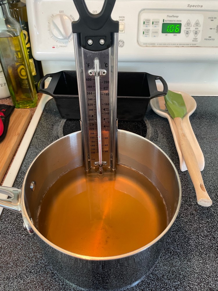Once we brought it inside we strained it again before the final boil. We used a candy thermometer to get the syrup up to the correct temperature for syrup. Once your syrup hits 7 degrees Fahrenheit over the boiling point of water (which for us is 219 degrees Fahrenheit) your final boiling temperature can change depending on the elevation where you live, but it will always be 7 degrees F over the boiling point.