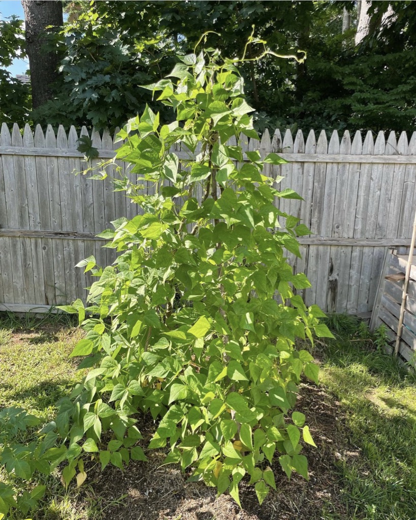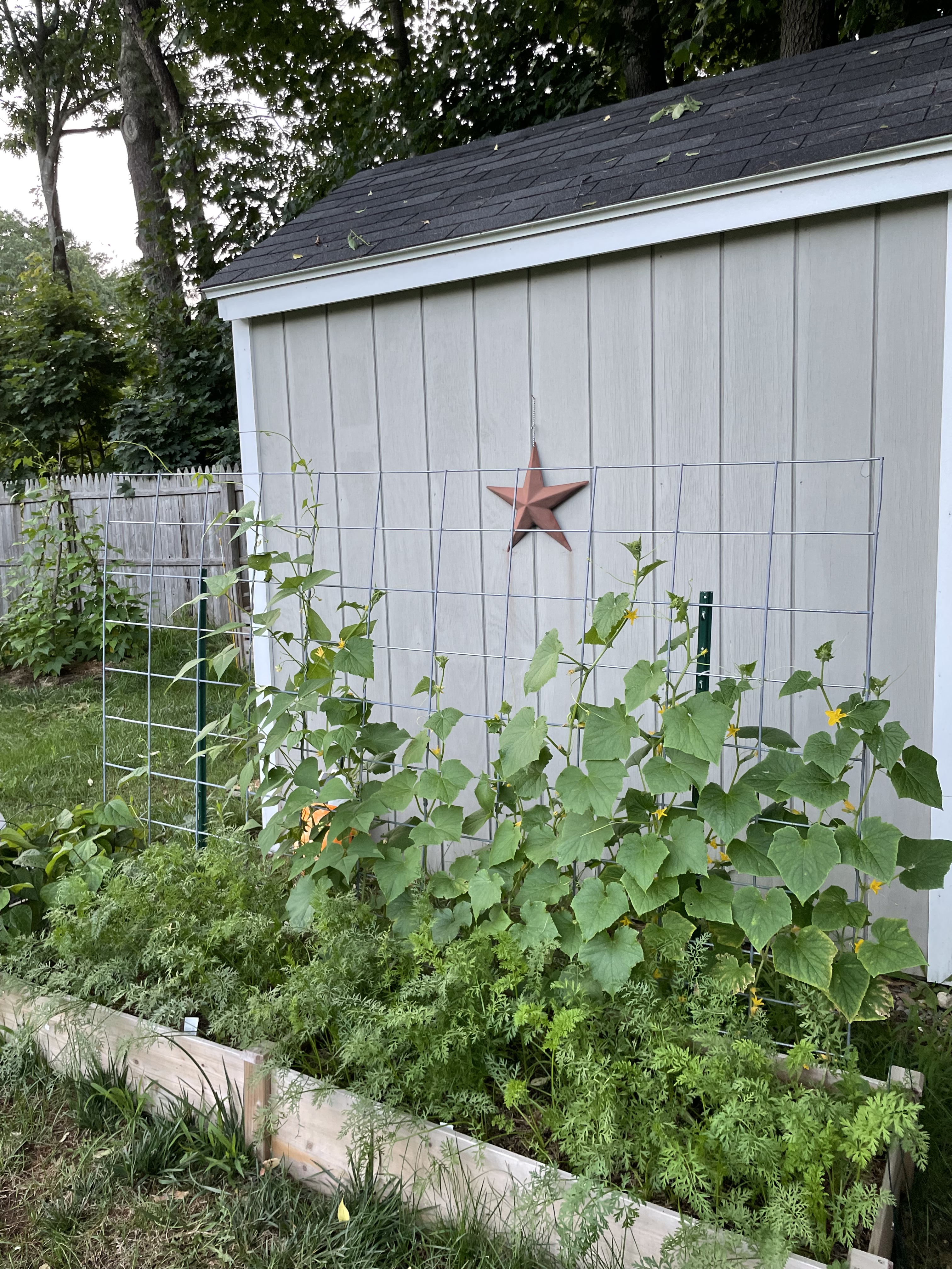 We grow our delicata squash, luffas, cucumbers, green beans, peas, and sugar snap peas up cattle panel trellises. We also have a green bean teepee. This year we will be trying our hand at the Three Sisters gardening method and growing some of our green beans up our corn over a bed of squash.