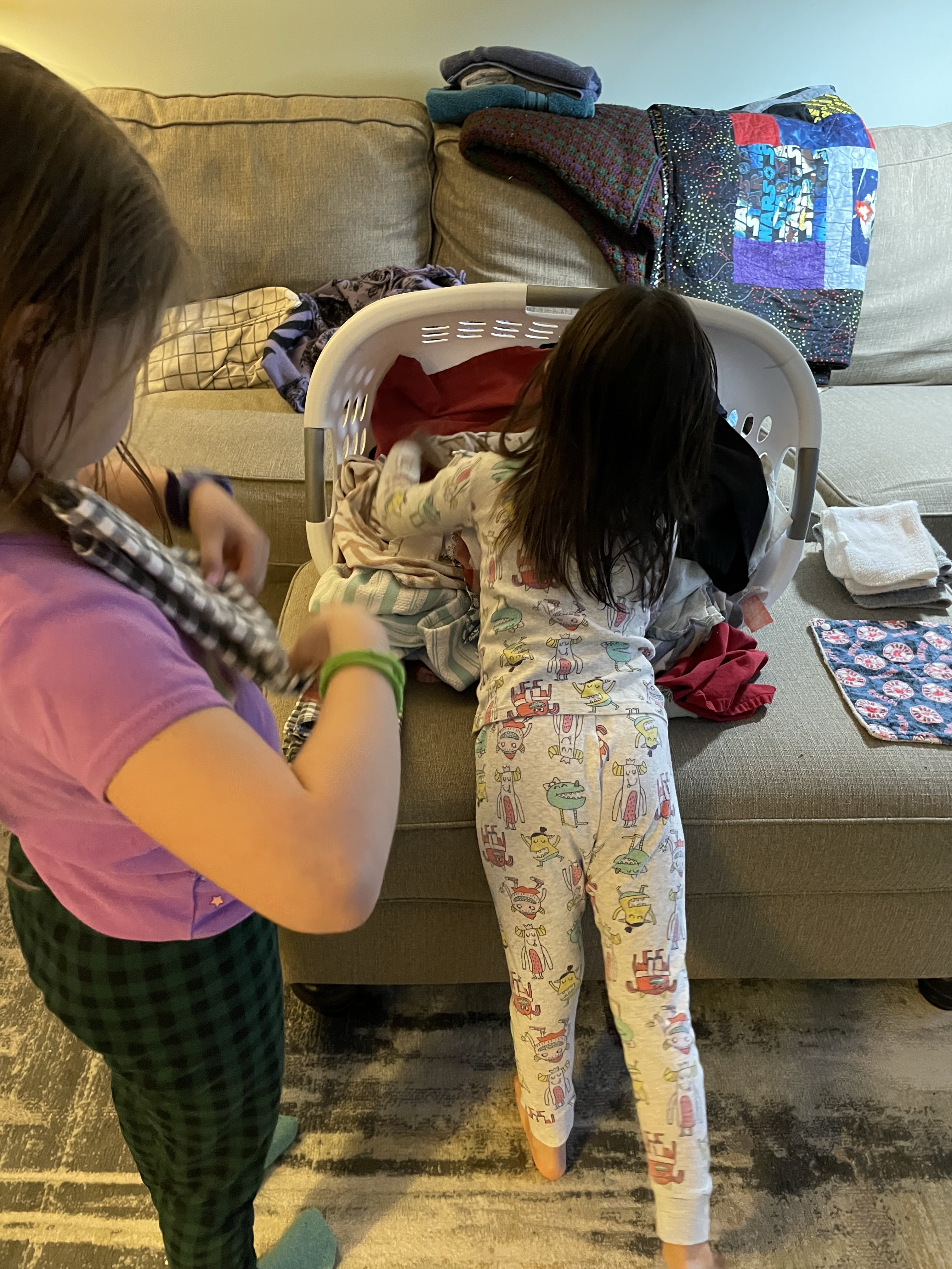 It might be hard to hear, but you don’t NEED paper towels, even for really yucky messes, even for bacon (but I would not use your pretty holiday themed tea towel for that chore). It all can go into your washer and come out just fine. We shake out excess food or yucky stuff into the trash or even spray with the hose outside, but think of all of the things you normally wash off in your washing machine when your house gets hit with the flu. Your washing machine should be able to handle your kitchen mess, without an issue.