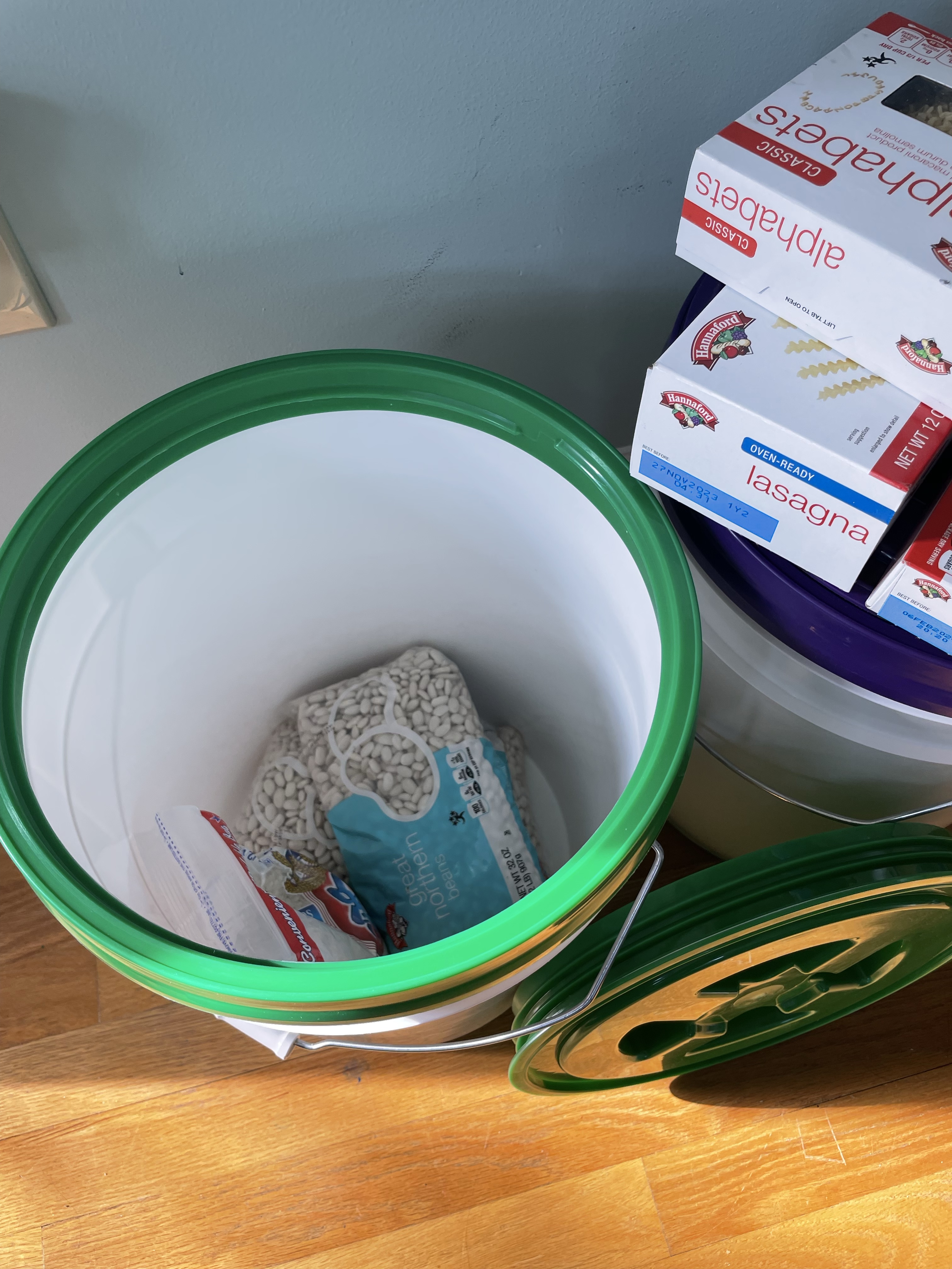 We keep our backup food in 5 gallon food safe buckets with twist top lids that are pest safe. We store items in these that have weak outer packaging, jars and cans are stacked in the pantry. The items that get stored in these are not bulk giant bag items, though they could be, small bags just make it easier for our family to rotate through, and it is easier and less of an initial investment to slowly create a backup supply. I just pick up an extra bag or box at the store when its in the budget.
