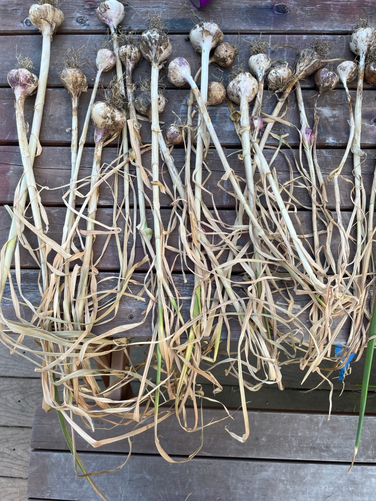 When we talk about harvesting garlic its all about clues and observations. We talked about how hardneck garlic produces scapes, those should be cut before they uncurl. Once you get past that part of your harvest it is time to start watching your garlic’s leaves. Once about half of your plant appears brown and dry it is time to harvest them.