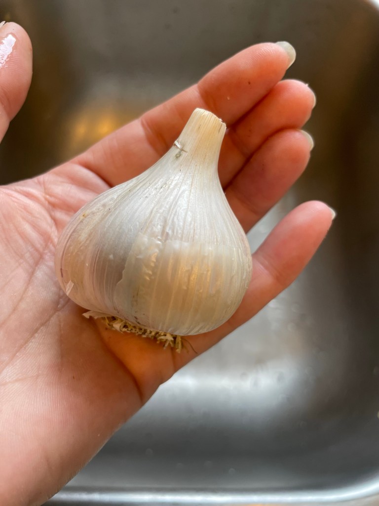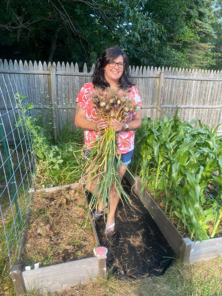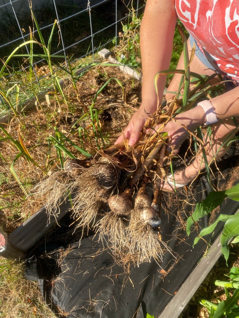 Over the last two years it has also become one of my Top 5 favorite foods to grow in our back and front yard gardens. In our front yard, we have our own little micro climate area that seems to stay warmer than the rest of our yard, it is right against our house and south facing, and is the perfect place to plant and grow softneck garlic even in our cold climate in Maine. Our backyard garden beds hold our hardneck varieties. I love that we’ve been able to grow a bit of both and have some expanded growing space for it.