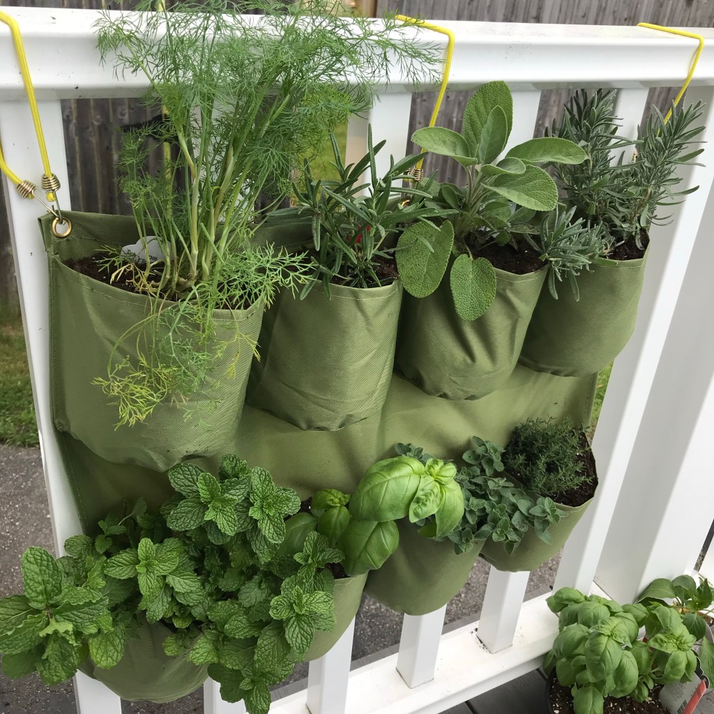 Our very first summer here all we grew were herbs on our porch. It was perfect. I found this fantastic hanging planter at our local nursery/greenhouse. (The quality that I am seeing online to link for you is not what I would recommend). So, try to support a smaller local garden store, they take care in selecting what they choose to sell to you and it will pay off on the quality side of things. I will mention that the downfall of these hanging pocket planters is that you really have to pay attention to watering if you live in a warm/hot area as the soil dried out quickly.