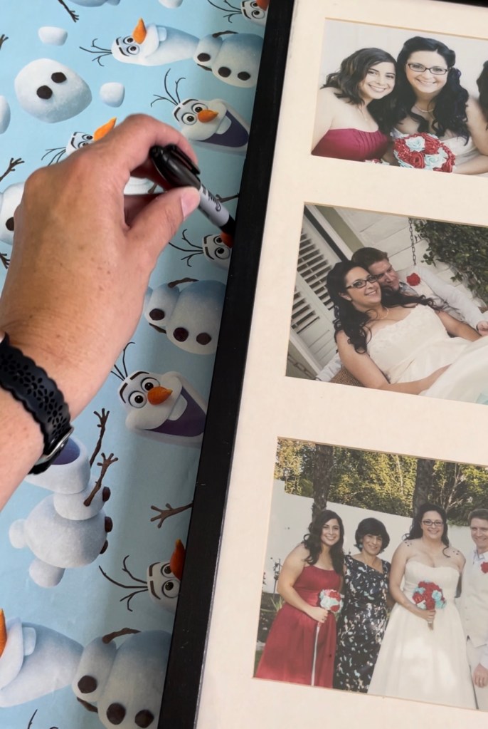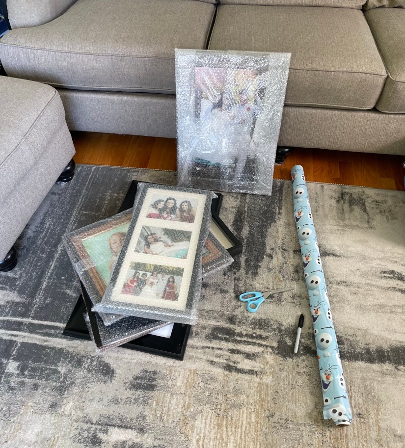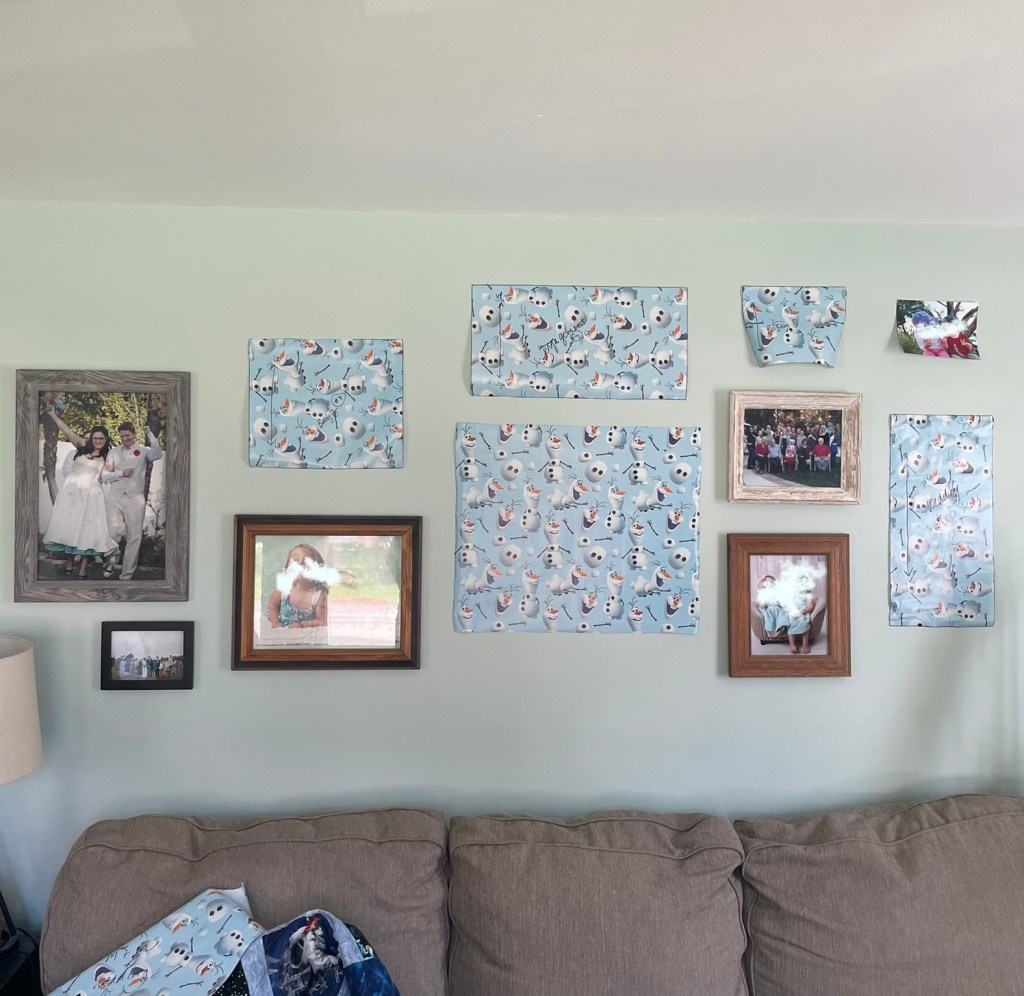 1. Collect all the pictures and frames you want to display and grab your roll of wrapping paper