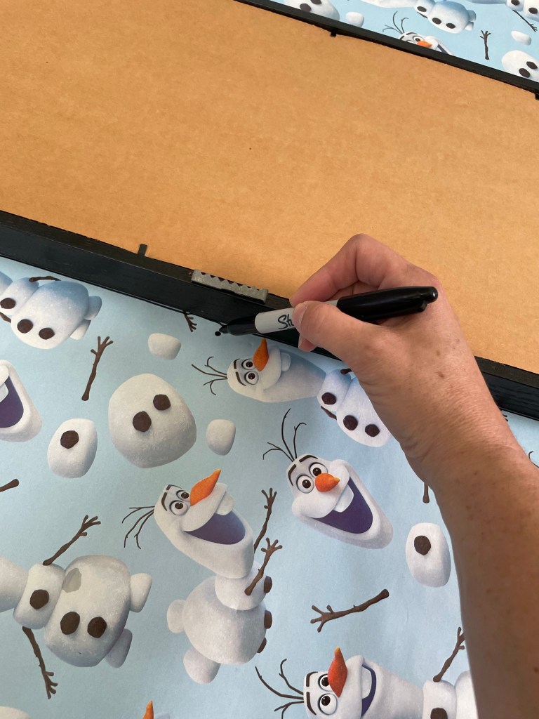 4. Start tracing all of your frames onto the wrapping paper. Cut them out as you go. Label the paper! I use descriptions and a number (use a small piece of masking tape on the back of the frame to do this). This makes it so that when you’re putting the paper up you really know what you’re putting next to each other. Also make sure to indicate which direction that piece of paper should be when it’s on the wall. I use up and down arrows.