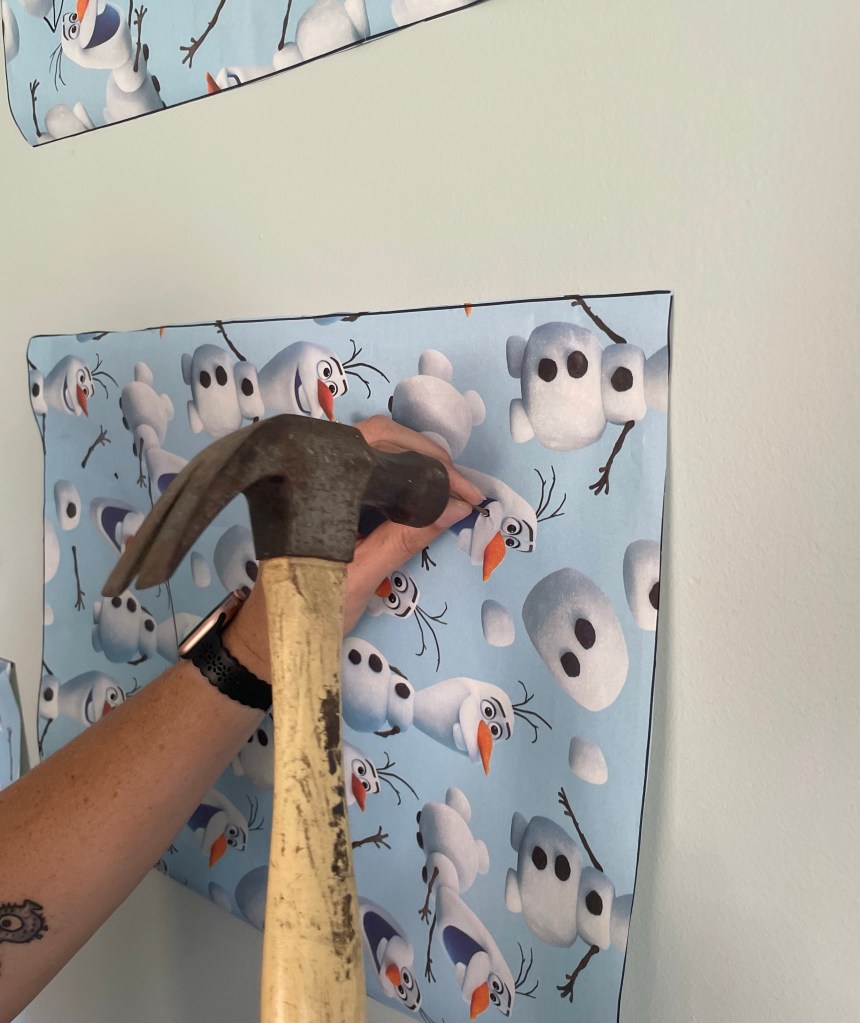 7. Once you have and arrangement you like you can start putting your nails in. Just hammer right through the wrapping paper. This is where you need to use your level, if your frame has two points of contact with the wall you must make sure that your wrapping paper placeholder is level before you start hammering nails.
