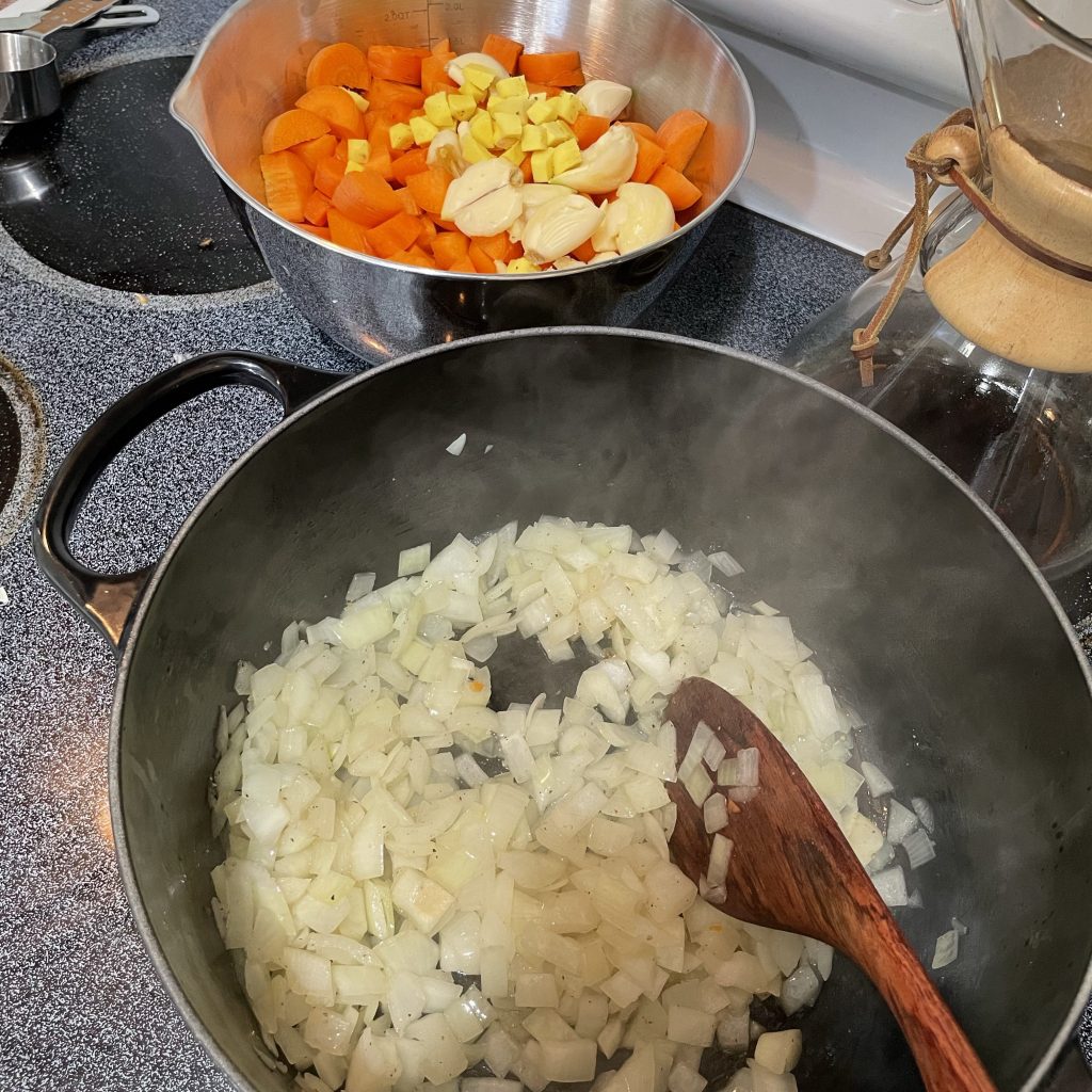 - Add the carrots, garlic cloves, and ginger stirring occasionally for another 8-10 minutes.