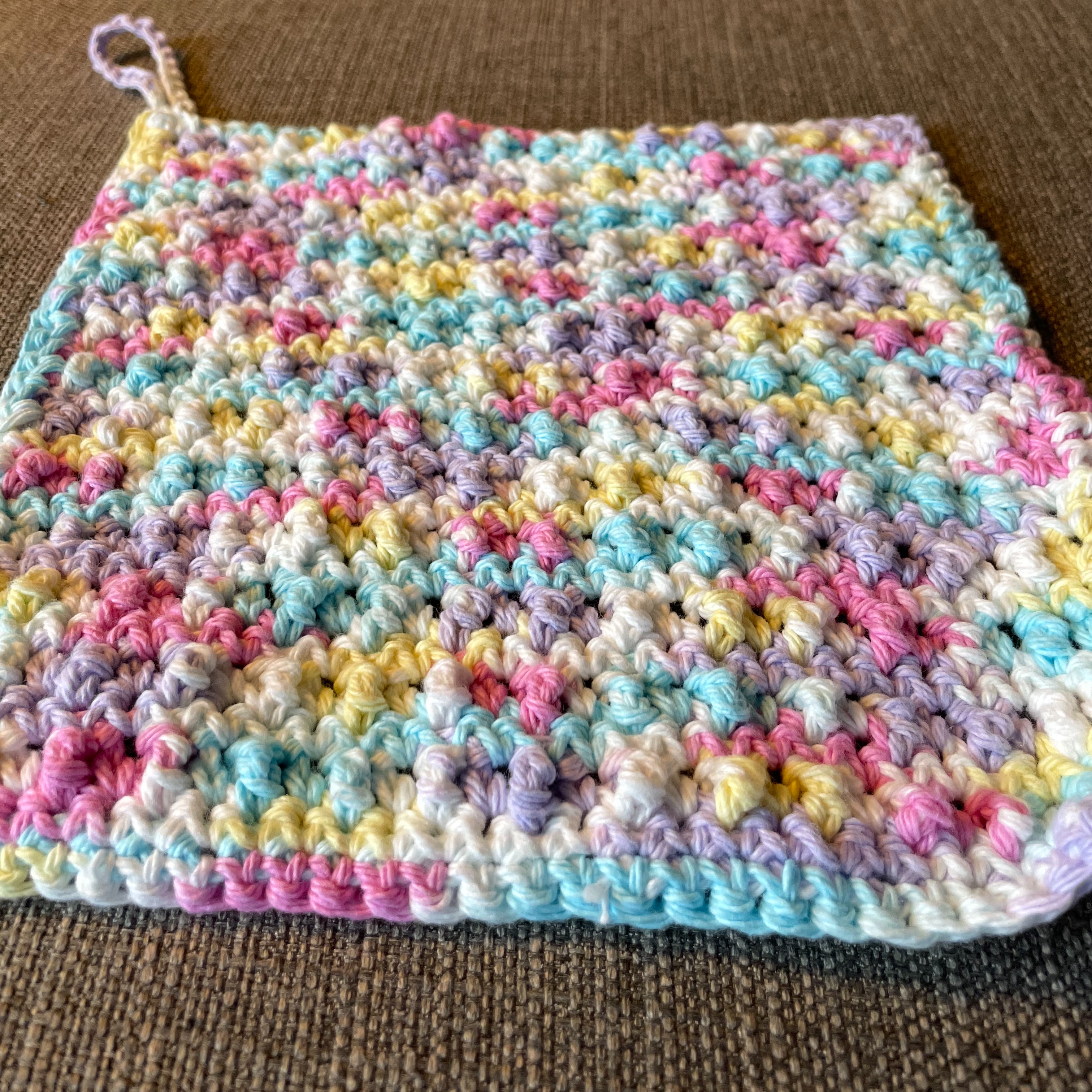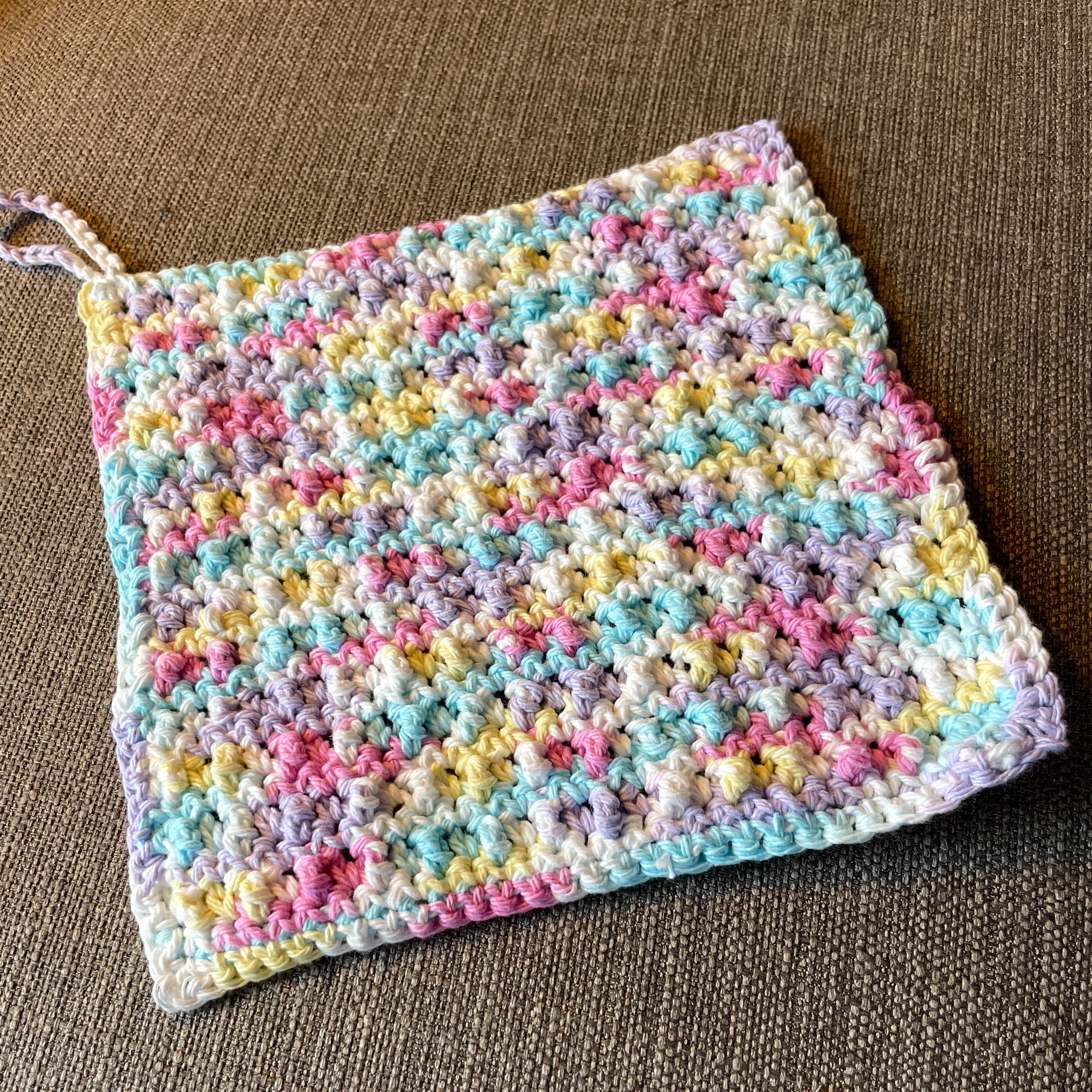 This one is made with a Lily Sugar’n Cream Scents yarn, in Fleur de Lavender, which I did not realize until I was already home and hooking up my project. I will probably give it a couple of washes before use as the scent is fairly strong.