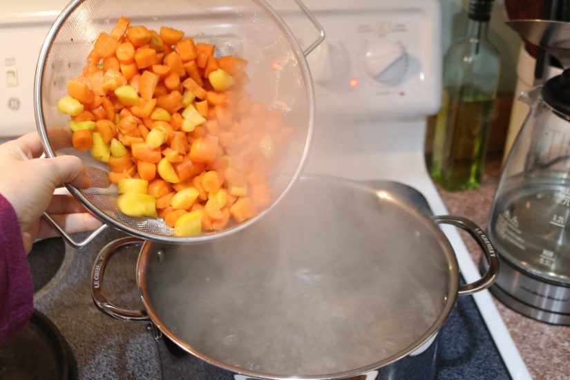4. Carefully add carrots (2-3 cups at a time) to boiling water, and boil for 3 minutes