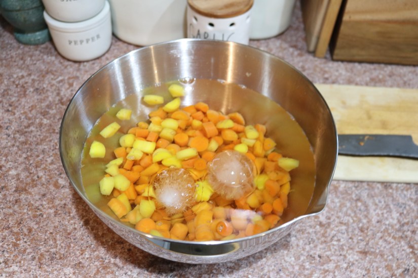 5. While carrots are boiling prepare a bowl of cold water with ice cubes (I like to use large cocktail ice cubes for this as it keeps them from quickly melting and makes it easy to pull them out when once you’ve stopped the cooking process)