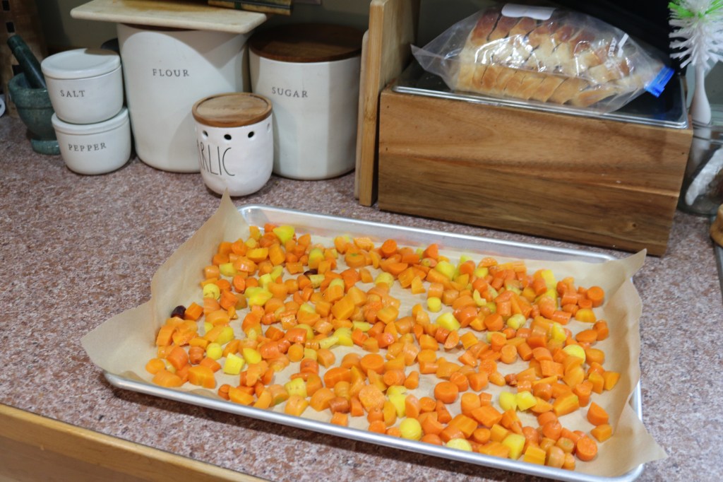 3. Roughly chop your carrots into 1/2″-3/4″ cube-ish pieces